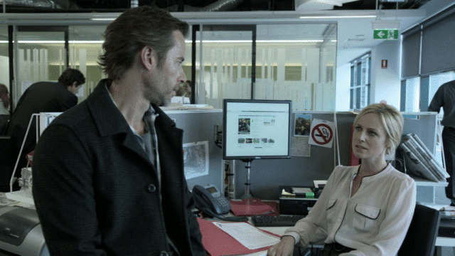 Widowed former lawyer Jack Irish is not a detective yet dabbles in a major investigation and apologizes for being an inconvenience to the politician calling him a pain in the ass. Frumpled, five o’clock shadow Jack is not a crook but works fixed horse races and isn’t good with his hands but is a woodworking apprentice. Pearce’s multifaceted character was slick in his legal heights yet in Bad Debts Jack is wonderfully unable to pin down despite appearing in almost every scene. He makes notes, both shrewdly piecing together what others miss yet is often out of his depth in a scrappy situation and too downtrodden to care. He’s reluctant to wear the old high-end suits his wife had chosen, and her murder is revisited in one eerie dream sequence with echoes, shadows, and ghosts. Jack’s grief lingers and everyone tells him to drop this current crusade, but he messed up the original case and can fix it now – unlike his wife’s murder. Although in peril almost constantly, this crime has drawn Jack out of his ho-hum, and Marta Dusseldorp’s (A Place to Call Home) reporter Linda Hillier stands her ground in their flirtations and factual exchange. Smart and confident, Linda is smitten nonetheless by Jack’s out of practice gallant. She admits her intrigue, and there’s a certain superb equality to their who’s trying to impress whom banter and kisses amid the shell company paper trails and sharing food. Linda wants to know Jack’s reasons why, and her investigative curiosity means she won’t lay off an award winning scoop even when threatened. She doesn’t want anyone to tell her what to do – even Jack – and Pearce and Dusseldorp combine for delicious performances with great delivery and prop usage upping the details, wine, and chemistry.