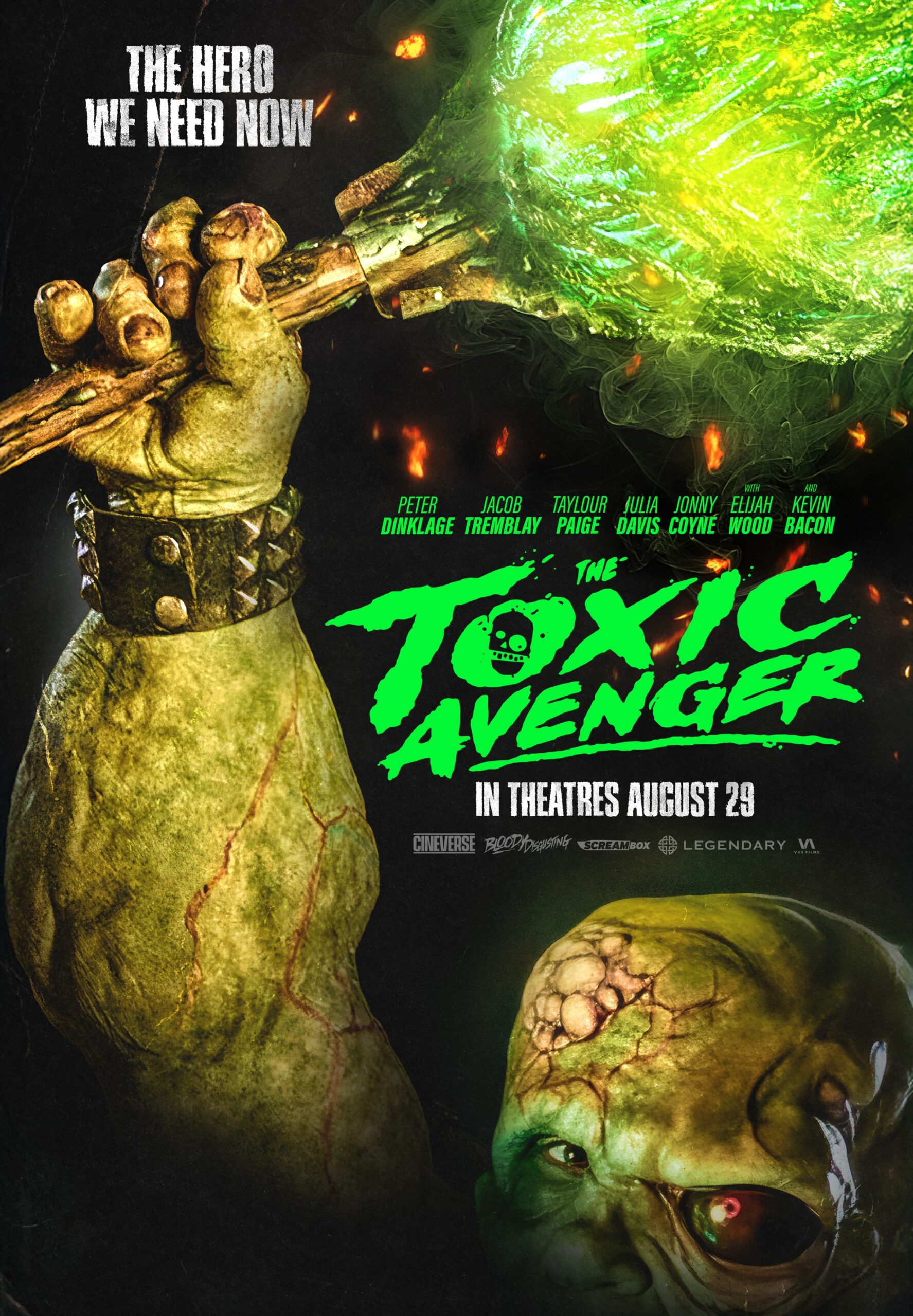 Blair’s take follows Winston (Dinklage), a widowed stepdad working tirelessly at a toxic pharmaceutical plant owned by Bio-Toxiphetamine Hydroxylate to support his stepson Wade (Tremblay). Upon getting news of a fatal brain condition, and unable to raise the money for his treatment, Winston attends a banquet of the president of BTH, villainous egomaniac Bob Garbinger (Bacon). Following an embarrassing dismissal, an unfortunate encounter with rogue employee and whistleblower J.J. Doherty (Taylour Paige) left him disposed of in a vat of the company’s toxic waste. This incident would lead to a transformation in Winston, changing him from man to superhuman, creating The Toxic Avenger. Armed with his newfound abilities, he seeks to protect St Roma’s Ville from the greedy corporate invasion and their pollution, all while trying to be the best father he can be for his son.